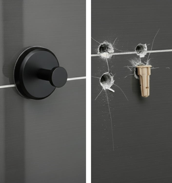 Vergessen Sie Bohren und Kleben! Die innovative TWIST & LOCK-Vakuum-Technologie bietet die perfekte, rückstandsfreie Lösung. Diese Haken lassen sich mühelos auf jeder glatten Oberfläche (z.B. Fliesen, Glas, Acryl, Spiegel und glattem Metall) befestigen. Genießen Sie dauerhaften Halt ohne das Risiko von Wandschäden.